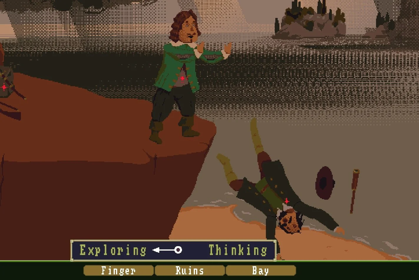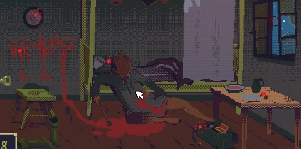 De art style is uniek en waarschijnlijk redelijk verdelend. De karakters wobbelen een beetje heen en weer terwijl er naargeestige muziek op de achtergrond draait. De atmosfeer is ligt er doorgaans lekker bovenop. Een redelijk vroeg scenario speelt zich af in een bar. De barman staat beneden een glas te poetsen en de bezoekers kaarten er op los. De muziek is uitbundig en afleidend. Ga je echter naar de 1e verdieping zie je een bloederig tafereel met een drukkende sfeer en grimmige muziek. Het was wel erg typisch, dat wanneer ik in dit scenario na wilde denken, ik de bar ontvluchtte en de bloedbesmeurde muur verkoos om even in rust naar de zinnetjes te staren en over hun betekenis na te denken.