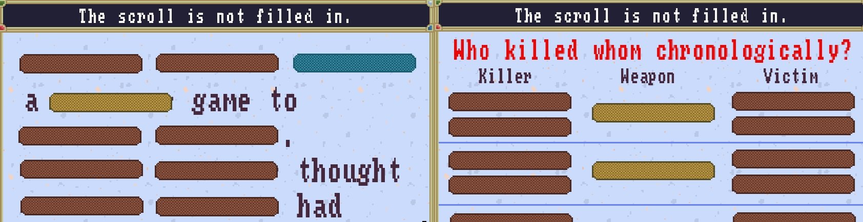 Echt een genot om een doorbraak te hebben, of puzzelstukjes te kunnen plaatsen en opeens verder te komen in het verhaal. Naast de puur zingebaseerde "wat is er hier gebeurd" puzzel zijn er ook meer bitesized puzzelblokken die een deel van de informatie van een scenario bevatten, zoals de namen van de karakters, of specifieke details die van belang zijn voor het huidige mysterie. Toch vind je vaak ook overzichten\details in het scenario zelf, waardoor je soms wat veel heen en weer aan het bladeren bent.